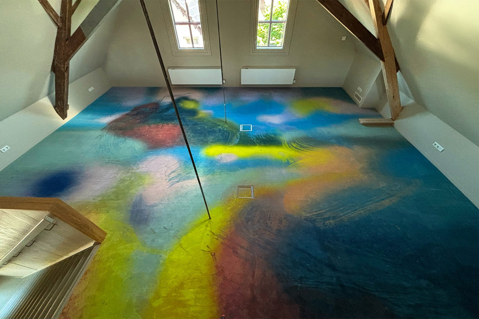De Ploeg is an artistic movement from their area known for painting au planair. The designs on the carpets come from quick ink drawings I also made in the landscape in a little sketchbook. These where later translated to digital illustrations inspired by the colours and brush strokes De Ploeg are known for. These strokes and colours dance around you while you walk on top of the carpets. Hugging you, or subtly guiding you into a specific direction.